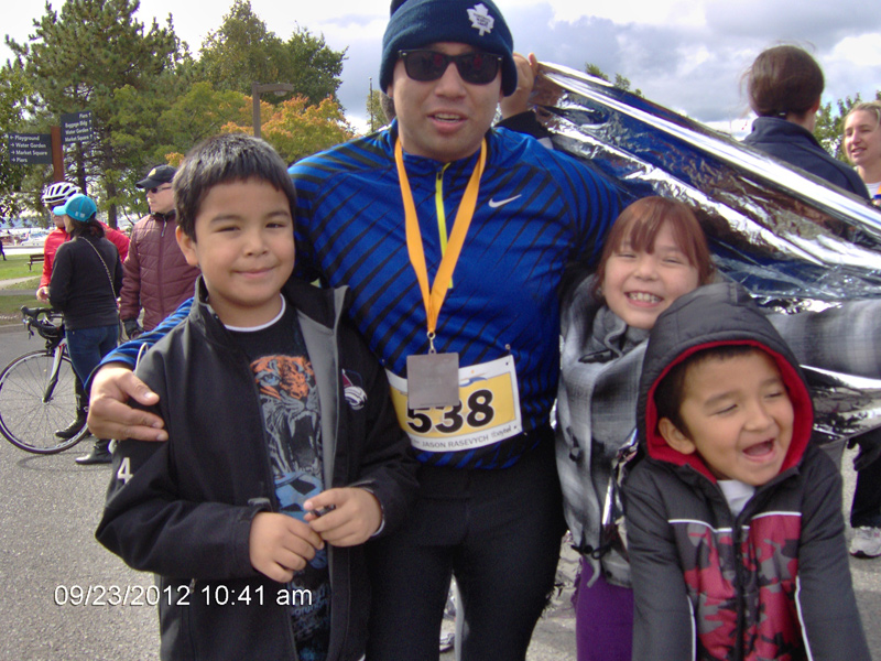 Jason Rasevych Economic Development Advisor at Matawa First Nations Management is pictured with “my niece and nephews who inspire me to provide a better future for our youth Jason completed the Thunder Bay Marathon and raised $300.00 for the Gathering of Rivers for Community Care. These dollars will go toward a Bursary to assist a Matawa youth go onto a Certificate Program, College or University after Grade 12. Said Jason “Next year I’m hoping to raise more, run the full marathon and pass the elderly couple that challenged me along the way". |